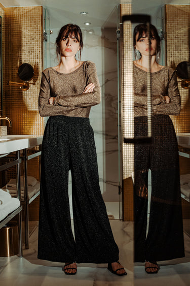 The Flamboyant Bodysuit redefines glamour with a touch of comfort. Crafted in glittery gold stretch knit, this long-sleeved bodysuit wraps the body softly while offering subtle shimmer. Its boat neckline enhances the silhouette with elegance, and the O-shaped opening at the back adds a seductive note. Ideal for glittering evenings out or as luxurious everyday underwear, the Flamboyant Bodysuit perfectly combines style and ease.